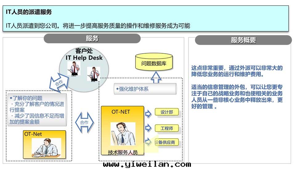 为(wèi)客戶承擔网(wǎng)絡、IT软(ruǎn)硬(yìng)件(jiàn)日(rì)常運行維护、故障处理(lǐ)、网(wǎng)絡及(jí)IT使用(yòng)培訓以(yǐ)及(jí)運行管(guǎn)理(lǐ)服(fú)務(wù)。